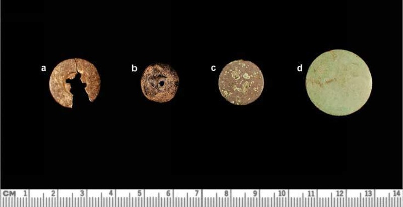 Các ví dụ được chọn về các nút và hạt được thu hồi từ AQE bao gồm nút xương (a), nút kiểu hạt phản lực (b), nút hợp kim đồng (c) và nút hợp kim đồng (d). (Hình ảnh do Trung tâm Nghiên cứu Khảo cổ học William & Mary cung cấp)