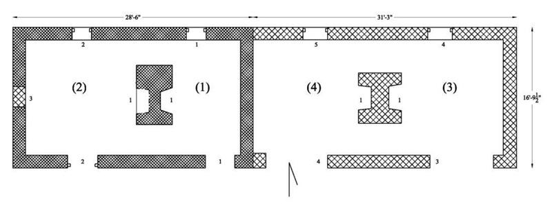 Sơ đồ tầng của AQE mô tả khối phía đông (hiển thị ở bên phải) và khối phía tây (hiển thị ở bên trái). (Hình ảnh do Trung tâm Nghiên cứu Khảo cổ học William & Mary cung cấp)