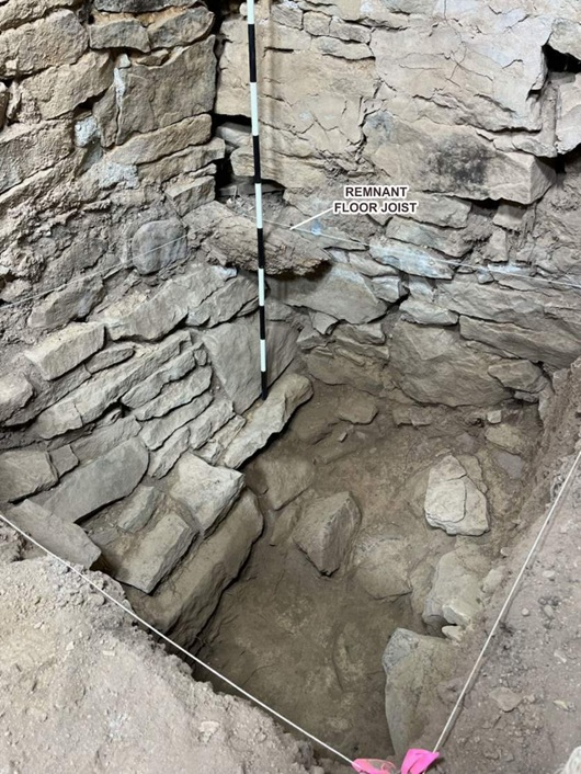 Các cuộc khai quật bên trong và ngay bên ngoài tòa nhà đã ghi lại nền móng bằng đá, các yếu tố sàn gỗ nâng cao ban đầu (dầm, kẹp, ván sập) và nhiều đặc điểm nền móng làm rõ việc xây dựng tòa nhà và những thay đổi sau đó. Bằng chứng về sự đốt cháy hoặc phá hủy lấp đầy trong một số bối cảnh, cùng với các trầm tích địa tầng hỗn hợp trong các đơn vị bên trong, chỉ ra các quá trình hình thành phức tạp — sửa chữa, sụp đổ và tái sử dụng — trong thế kỷ 19và đầu thế kỷ 20(Higgins et al. 2025).