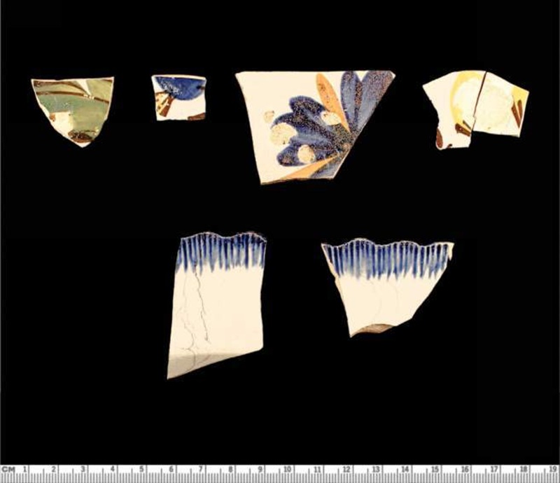 Các ví dụ được chọn về gốm đa màu ngọc trai (hàng trên cùng) và gốm có viền vỏ màu xanh lam (hàng dưới) từ tập hợp đồ tạo tác AQE. (Hình ảnh do Trung tâm Nghiên cứu Khảo cổ học William & Mary cung cấp)