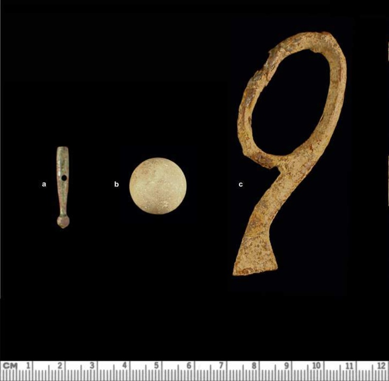 Các ví dụ được chọn lọc về các vật dụng cá nhân và hoạt động bao gồm đầu ô hợp kim đồng (trái), đá cẩm thạch (giữa) và mảnh cắt kéo (phải). (Hình ảnh do Trung tâm Nghiên cứu Khảo cổ học William & Mary cung cấp)